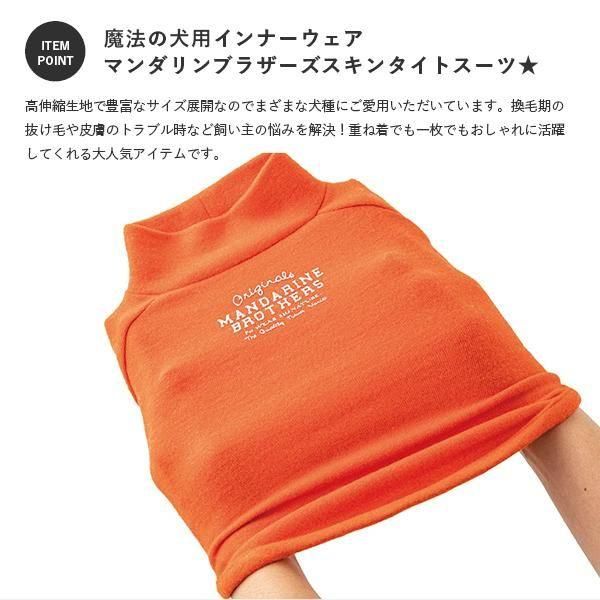 マンダリンブラザーズから魔法の犬用インナーウェアとして発売以来大ヒットしているスキンタイトスーツ。高伸縮生地で豊富なサイズ展開なのでまざまな犬種にご愛用いただいています。換毛期の抜け毛や皮膚のトラブル時など飼い主の悩みを解決!重ね着でも一枚でもおしゃれに活躍してくれる大人気アイテムです。