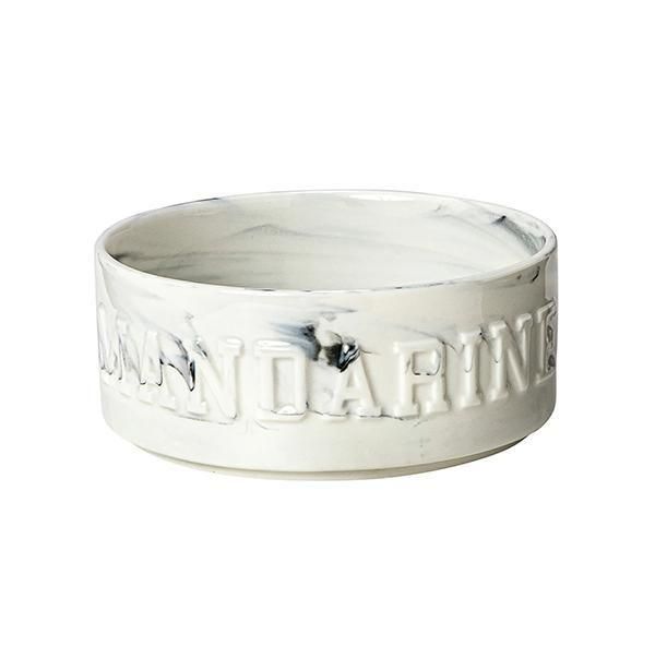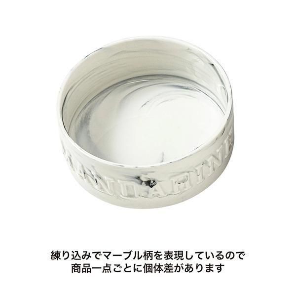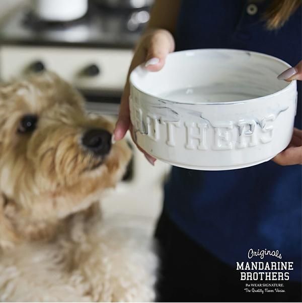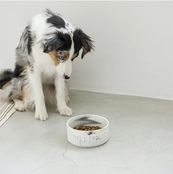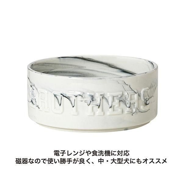 立体ロゴをあしらったマーブル模様がおしゃれなフードボウル 磁器だから程よく重量があり、底面にシリコーン付きでペットが鼻で押してもボウルがズレにくい仕様です。電子レンジや食洗機にも対応。ギフトにも最適なフードボウルセットです。